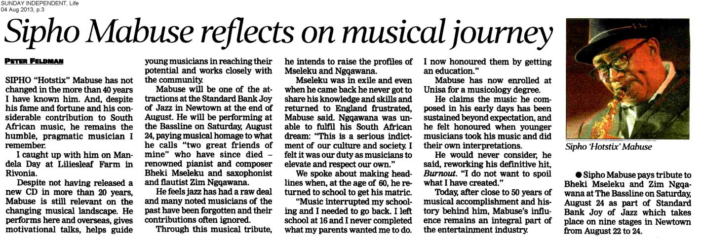 Hotstix, Hotstix Press, Music, News, South African Music Sipho Mabuse Reflects On Musical Journey | Sunday Independent, Life, 4 August 2013 Posted by Martin Myers on 7 August 20134 October 2013 Discover more from Triple M Entertainment Subscribe to get the latest posts sent to your email. Type your emailโฆ Subscribe Share this: Click to share on Facebook (Opens in new window) Facebook Click to share on X (Opens in new window) X Click to share on WhatsApp (Opens in new window) WhatsApp Click to email a link to a friend (Opens in new window) Email More Click to share on Pinterest (Opens in new window) Pinterest Click to print (Opens in new window) Print Click to share on LinkedIn (Opens in new window) LinkedIn Click to share on Tumblr (Opens in new window) Tumblr Like Loading... Related