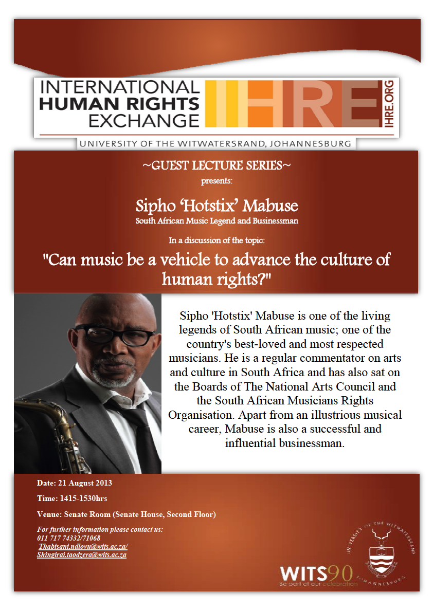 Hotstix, Music, South African Music TALK – CAN MUSIC BE A VEHICLE TO ADVANCE THE CULTURE OF HUMAN RIGHTS? WED, 21 AUG, 14:15, SENATE ROOM Posted by Martin Myers on 19 August 20134 October 2013 Discover more from Triple M Entertainment Subscribe to get the latest posts sent to your email. Type your emailโฆ Subscribe Share this: Click to share on Facebook (Opens in new window) Facebook Click to share on X (Opens in new window) X Click to share on WhatsApp (Opens in new window) WhatsApp Click to email a link to a friend (Opens in new window) Email More Click to share on Pinterest (Opens in new window) Pinterest Click to print (Opens in new window) Print Click to share on LinkedIn (Opens in new window) LinkedIn Click to share on Tumblr (Opens in new window) Tumblr Like Loading... Related