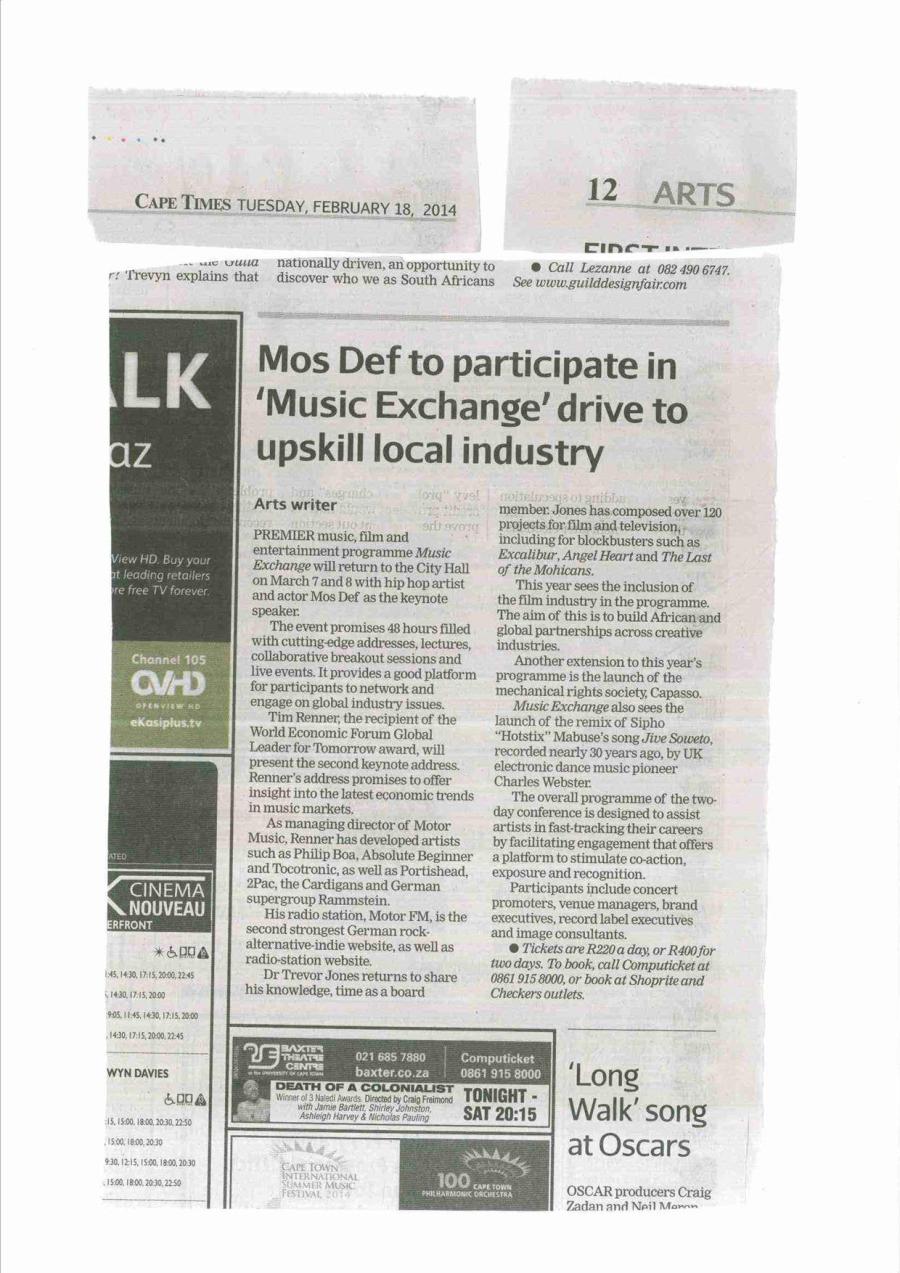 Events / Shows / Conferences / Private Functions, Music, Music Exchange, News, Press & Publicity, South African Music Cape Times – Feb 18th – Music Exchange Article – Mos Def to participate in conference Posted by Martin Myers on 18 February 201418 February 2014 Discover more from Triple M Entertainment Subscribe to get the latest posts sent to your email. Type your emailโฆ Subscribe Share this: Click to share on Facebook (Opens in new window) Facebook Click to share on X (Opens in new window) X Click to share on WhatsApp (Opens in new window) WhatsApp Click to email a link to a friend (Opens in new window) Email More Click to share on Pinterest (Opens in new window) Pinterest Click to print (Opens in new window) Print Click to share on LinkedIn (Opens in new window) LinkedIn Click to share on Tumblr (Opens in new window) Tumblr Like Loading... Related