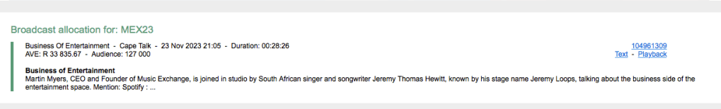 The Business of Entertainment on Cape Talk, hosted by Martin Myers every Thursday at 9 pm, has had a stellar year since the launch in May 2023. All the podcasts are loaded on the Cape Talk website on the podcast page